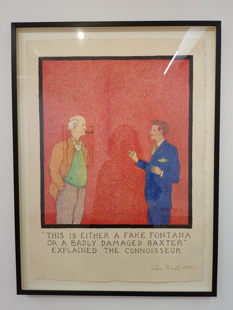 On reconnaît facilement ce qui est devenu la signature de Baxter : un dessin à la ligne claire, coloré au crayon et associé à un texte court, décalé, percutant, concernant. Le rapport texte-image semble avoir toujours été une évidence pour cet artiste qui comme nous le rappelle le communiqué de presse de la galerie, « après une formation à l’école d’art de Leeds […] comprend qu’il est davantage attiré par la poésie que par la peinture abstraite »